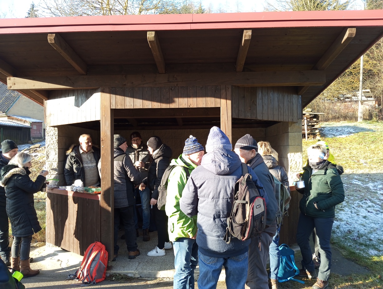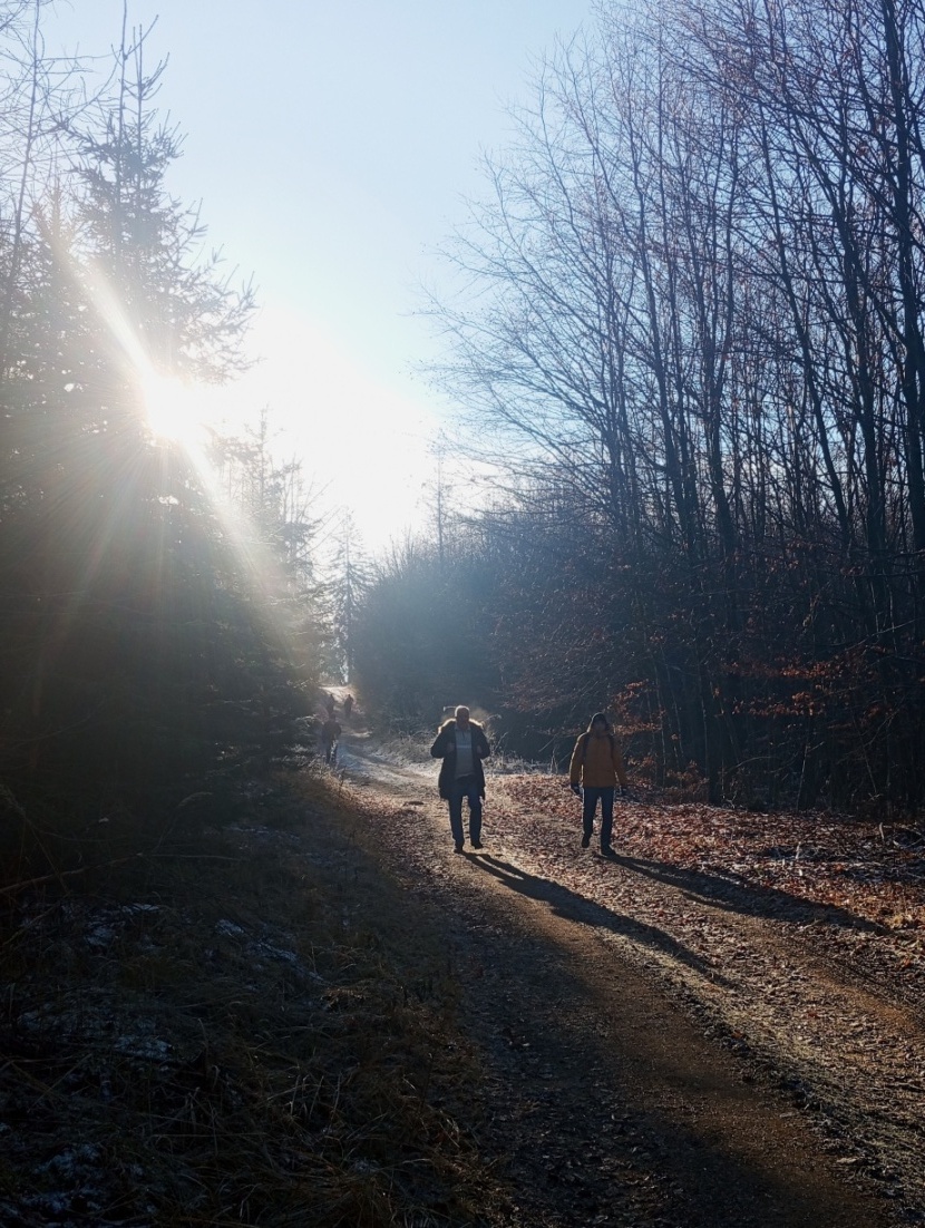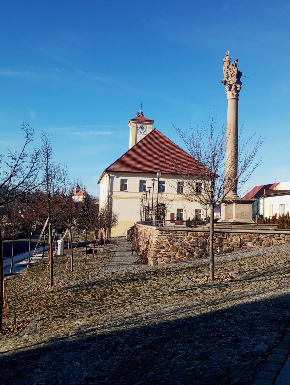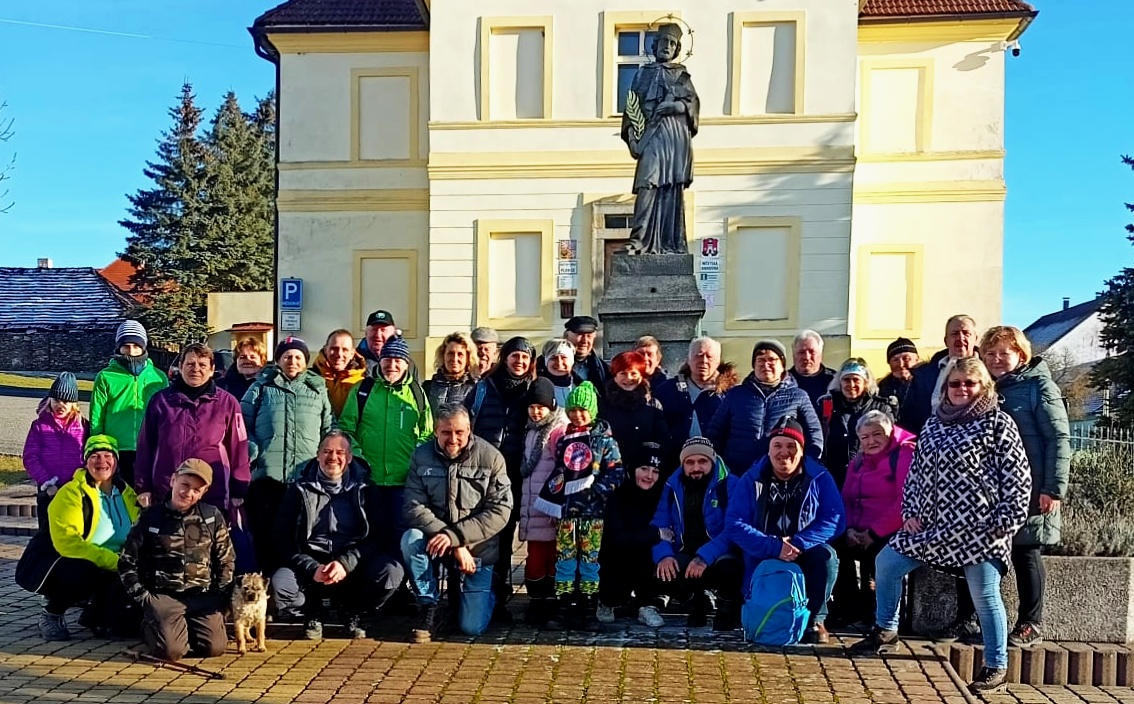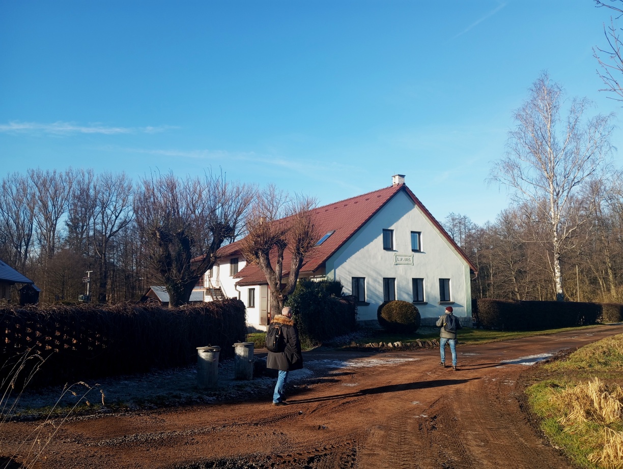 V mírně zamrzlé krajině se před námi objevil v dálce kostel a věž radnice v Plánici. Došli jsme k pile, bydlišti Jarušky Jánské a pak už jen kousek na náměstí s budovou empírové radnice.