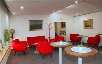 Divadelní kavárna nabízí výbornou kávu, velký výběr nápojů, čerstvé chlebíčky a zákusky z hotelu Ennius.