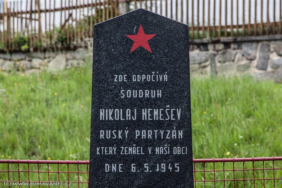 Jak nás upozornil místní chalupář, podle pamětníků nebyl Nemešev zabit v boji s nacisty, ale kolegou v hádce o nějakou místní ženu. Komunistickému režimu se hodilo z něj v roce 1971 udělat „v boji padlého partyzána“ a k připomínce hrdiny byl vystavěn nevkusný pomník v těsné blízkosti kapličky.