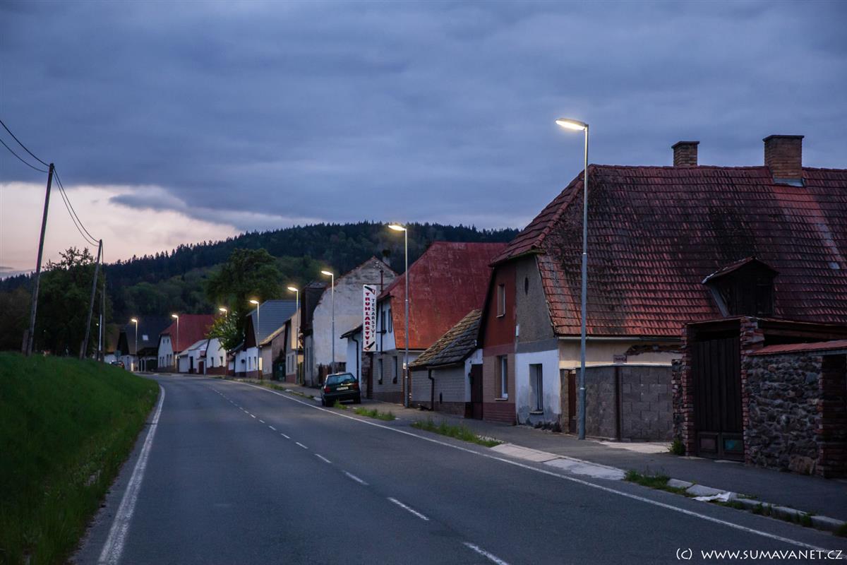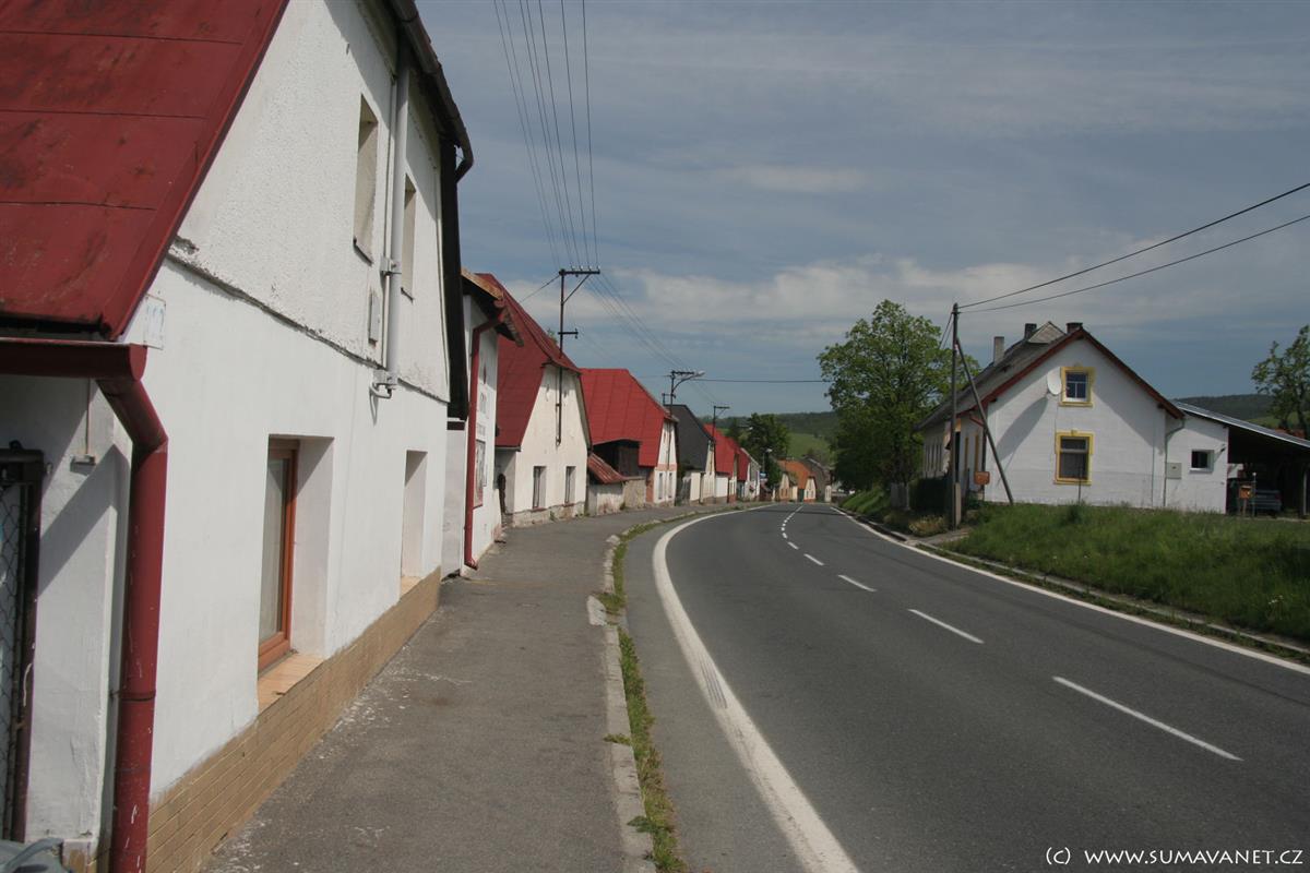 Domky jsou rozmístěny podél silnice na Kašperské Hory.