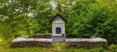 Kaplička obehnaná nízkou zídkou při cestě z Palvínova na Mouřenec je vzpomínkou na Třicetiletou válku.