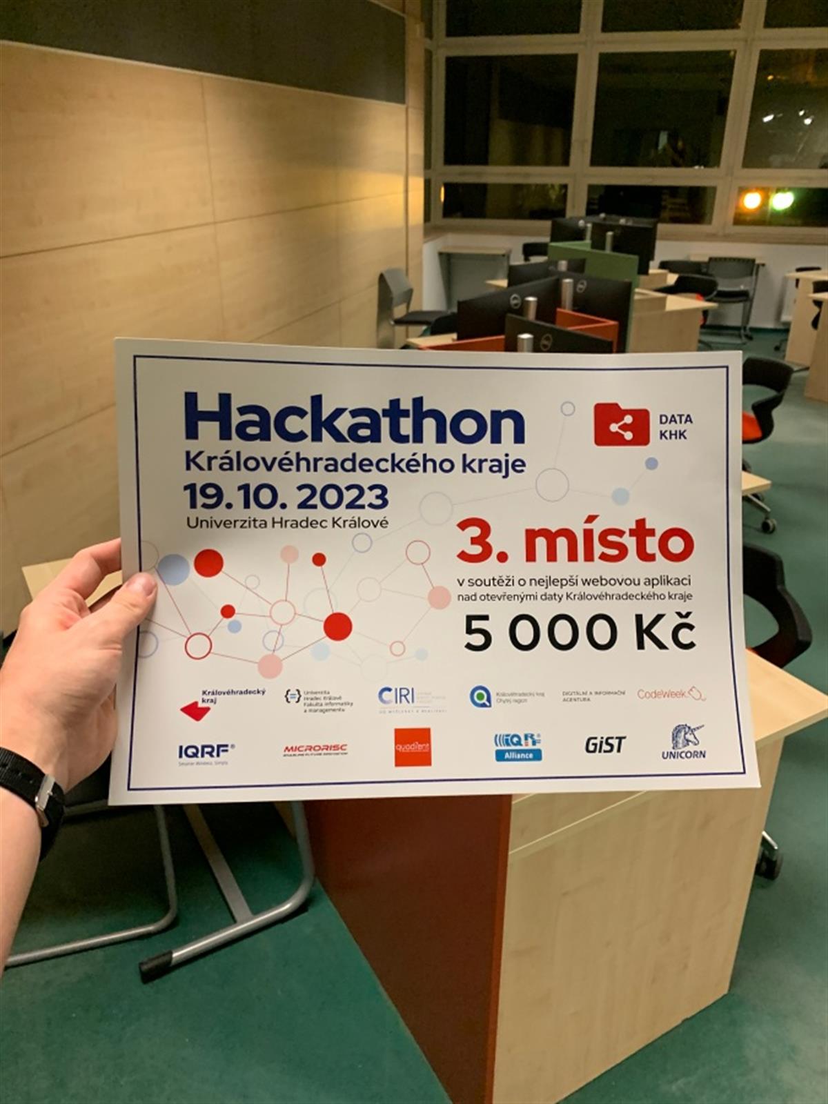 Den před hackatonem Plzeňského kraje se v prostorách Fakulty informatiky a managementu Univerzity Hradec Králové konala programátorská soutěž Hackathon Královéhradeckého kraje. Tým studentů klatovského gymnázia získal v opravdu náročné konkurenci týmů z celé republiky skvělé 3. místo a i tímto se kvalifikoval na celostátní kolo Hackujstat.cz.