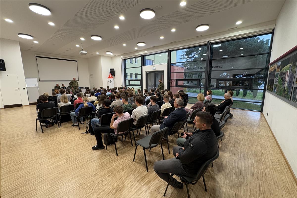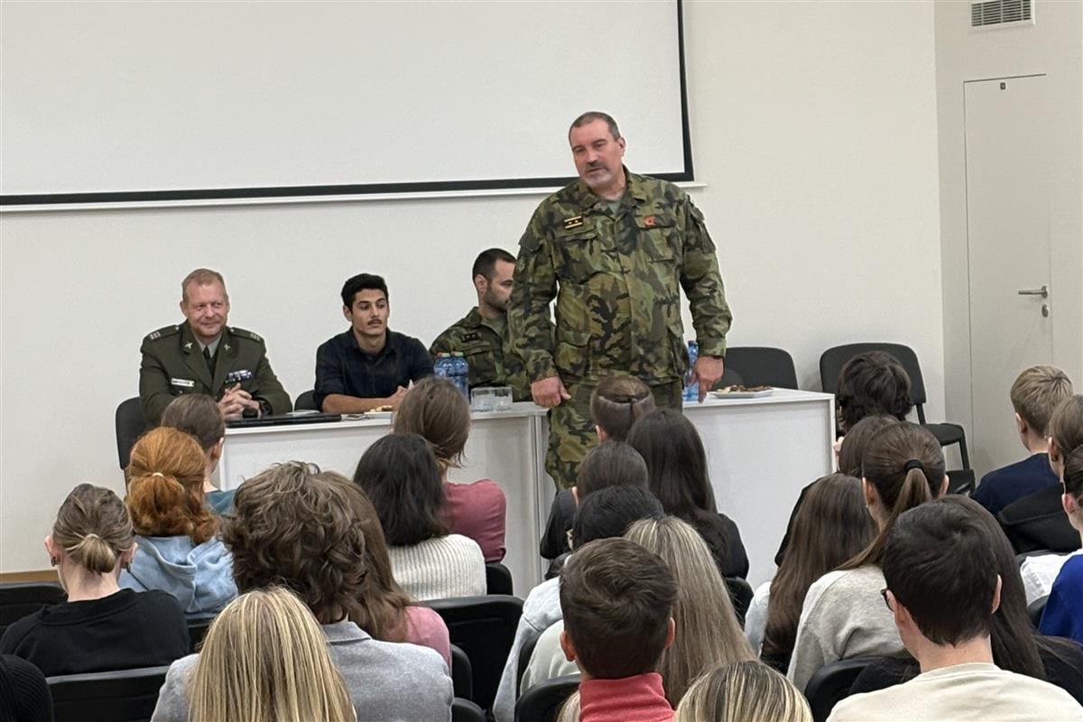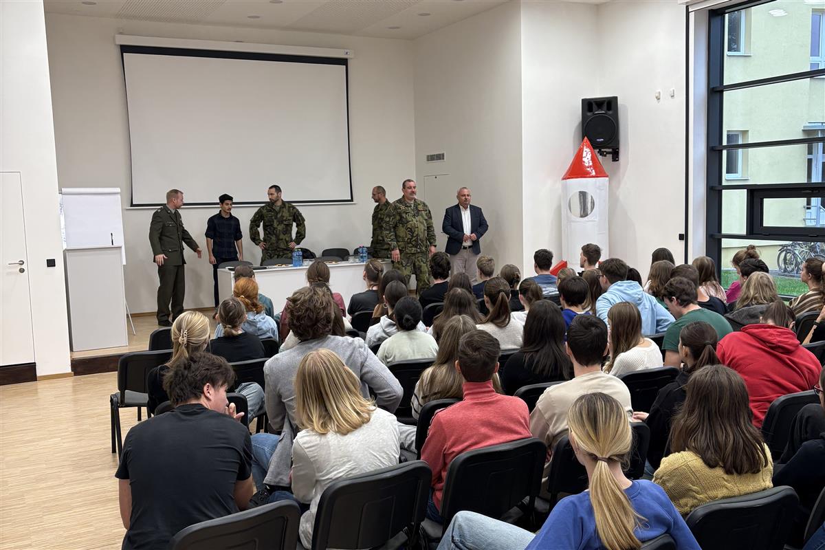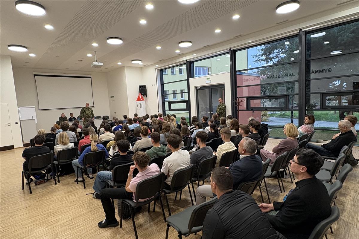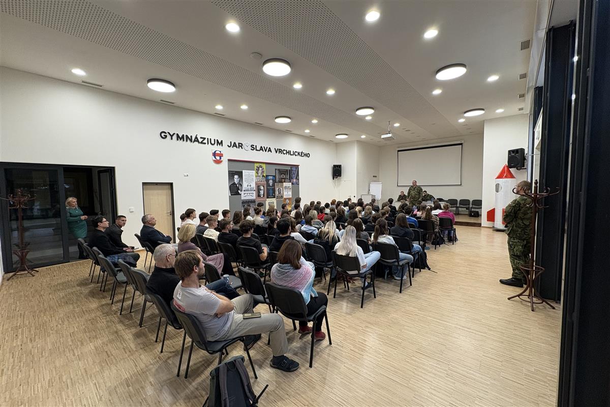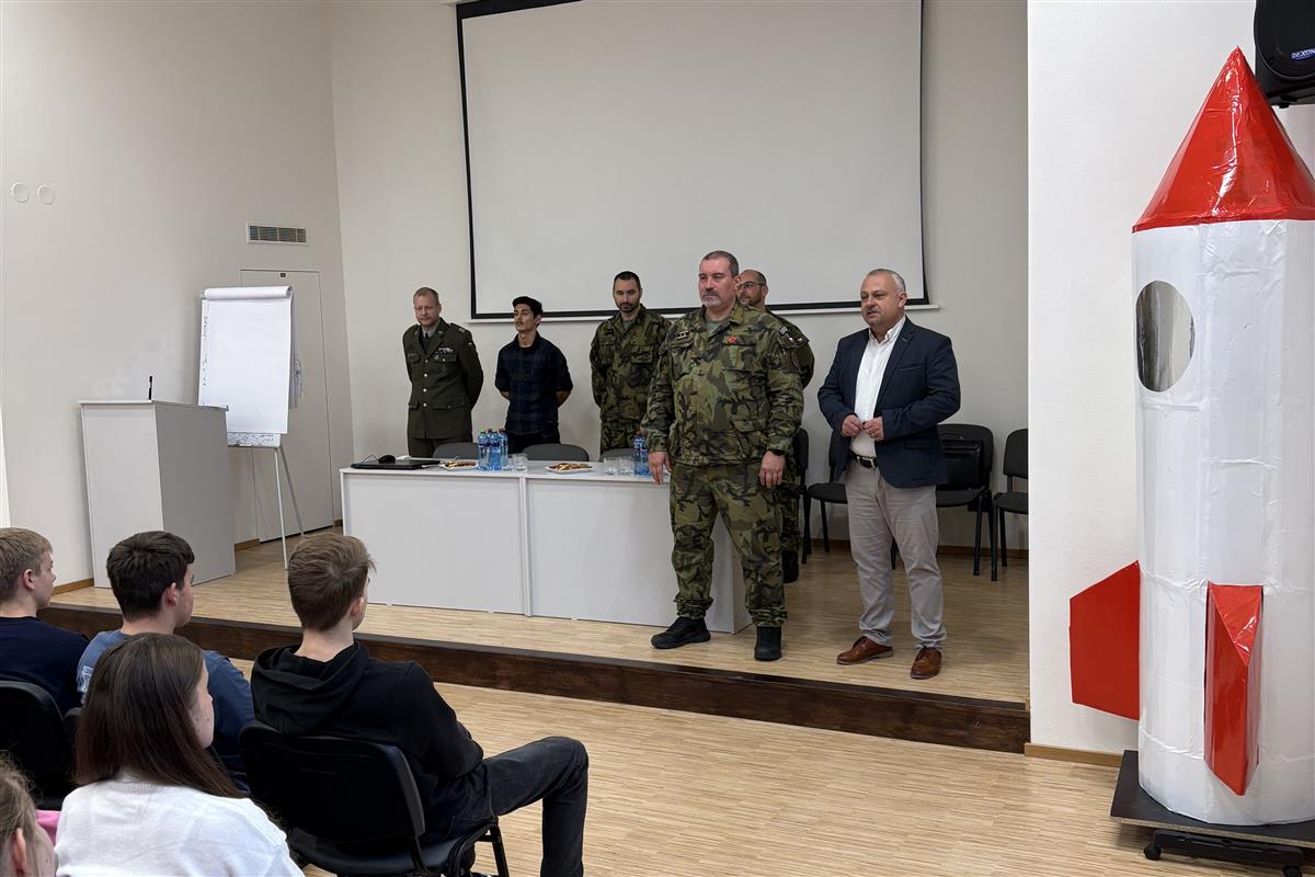 Ing. Pavel Lipka s několika spolupracovníky. Besedovali se studenty septim a 3. ročníků o aktuální bezpečnostní situaci v Evropě i ve světě, o dobrovolném vojenském cvičení pro studenty a možnostech zapojení se, o zahraničních vojenských misích a o dalších záležitostech souvisejících s úlohou Armády ČR a členstvím v NATO. Dostatek času byl věnován také dotazům studentů.