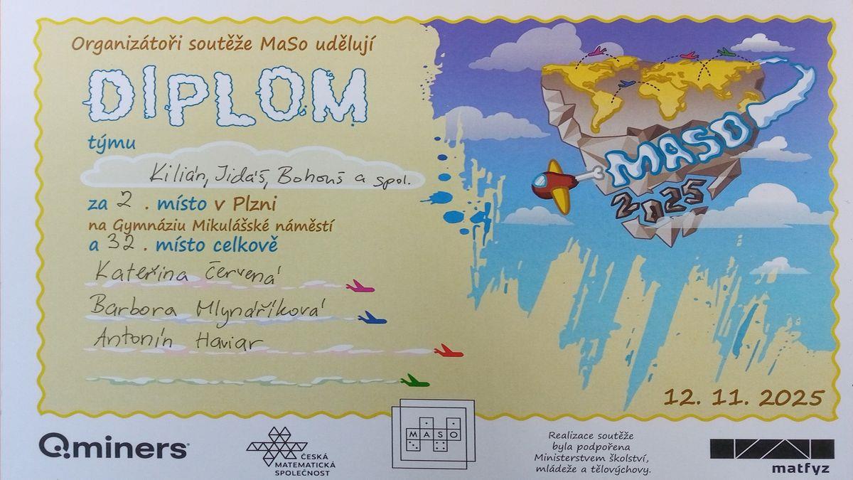 Naši studenti ze třídy V4.A – Kateřina Červená, Barbora Mlynáříková a Antonín Haviar – se včera zúčastnili matematické soutěže MaSo, kterou pravidelně organizuje Matematicko-fyzikální fakulta Univerzity Karlovy (MFF UK).