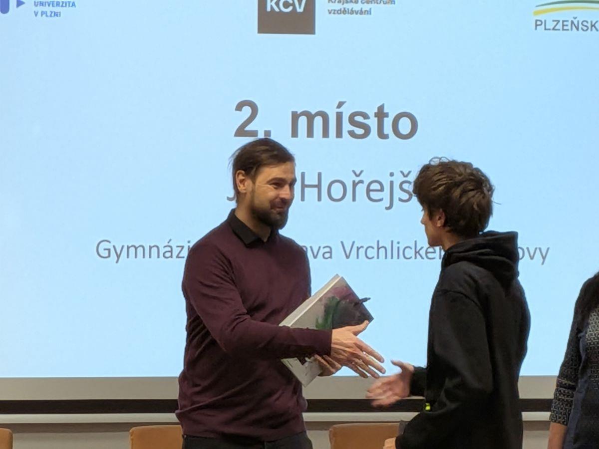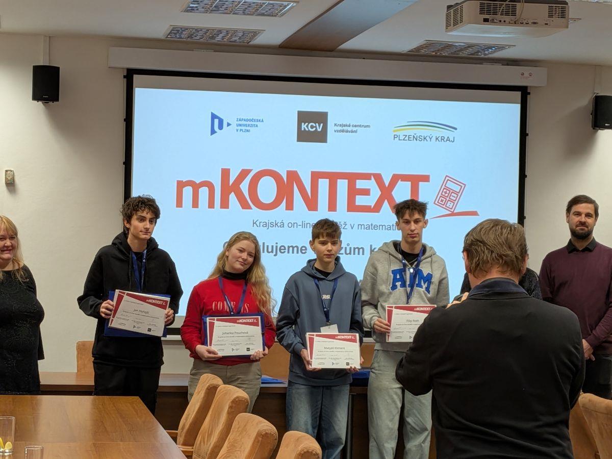 Ve čtvrtek 8. ledna 2026 proběhl finálový den krajské on-line soutěže v matematice mKontext. Student kvinty A Jan Hořejší obsadil druhé místo. Blahopřejeme.